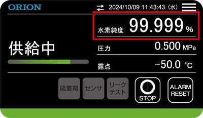 ガス濃度センサ搭載により、水素純度(酸素換算値)を表示します。