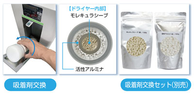 吸着剤は正面パネルからドライヤーを脱着することで容易に交換可能です。
