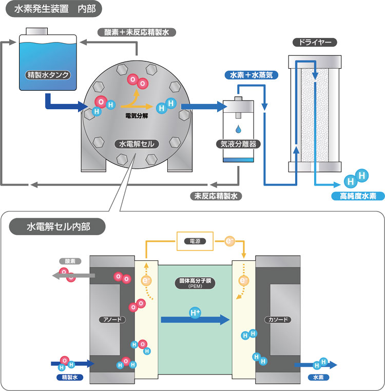 水素ガス発生方法の基本原理は、水の電気分解です。水に電気を加えることで水素と酸素が発生します。水電解セルから発生した湿った水素は、気液分離器、ドライヤーを通ることで水分が除去された高純度の水素となります。
