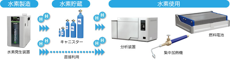 発生した水素を分析装置や集中加熱機及び非常用などの小型燃料電池に直接利用したり、キャニスターに水素を貯蔵することが可能です。