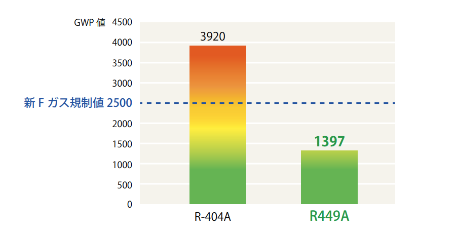 欧州新 F ガス規制で規定された地球温暖化係数(GWP)2500を大きく下回る低GWP冷媒、R449A(GWP 値 1397)を採用。