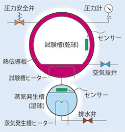 試験槽と蒸気発生槽がそれぞれ独立した二槽式構造を採用。一槽式構造と比べ、試験槽(乾球)の有効エリアを最大限に活用しつつ、蒸気発生槽(湿球)との間で及ぼし合う温度影響が少なく、より安定した試験評価が実現可能です。また、各槽は強度、温度分布に信頼性のある丸型チャンバーを使用しています。