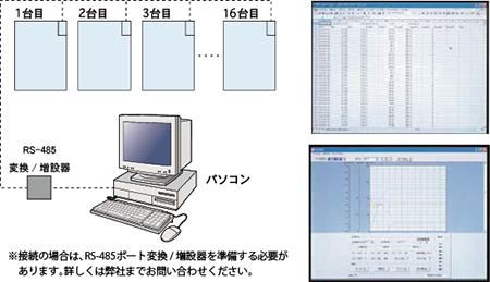 本製品はRS-485ポートを標準装備。専用ソフト(Windows対応)でパソコンからの試験条件の設定・確認、試験状態・トラブル状態の把握、データ処理などあらゆる作業が一括で行えます。また、1台のパソコンで最大16台の集中監視・集中管理が可能なネットワークシステム※を実現しました。
