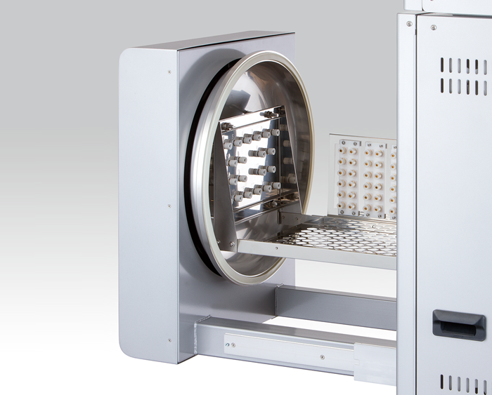 試料を載せる試料台(トレイ)は扉を手前に引く事で槽内から外部へ引き出すスライド方式。試験終了後の高温の槽内に手を入れる事なく、安全かつ容易に試料の出し入れができます。