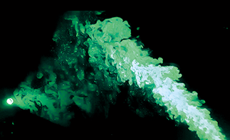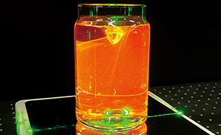 液体の流れを可視化するのに、蛍光粒子をトレーサーとして使用。蛍光発光(オレンジ)した粒子の様子です。