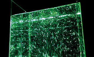 水槽内に固体粒子を懸濁させて、攪拌している様子を可視化しています。