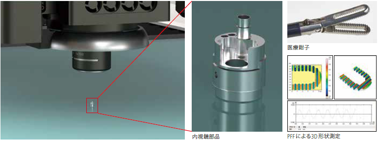また、従来の接触式測定機では困難な微細な輪郭形状も画像コントラストで3D測定するPFFやCPS(非接触変位センサ)で測定可能です。