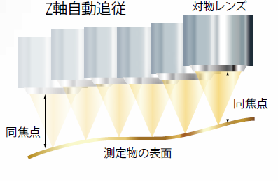 対物レンズからのレーザー照射による自動焦点。測定物の形状に応じて焦点が自動追従するため、ピント作業が省けて測定のスループットが向上します。
