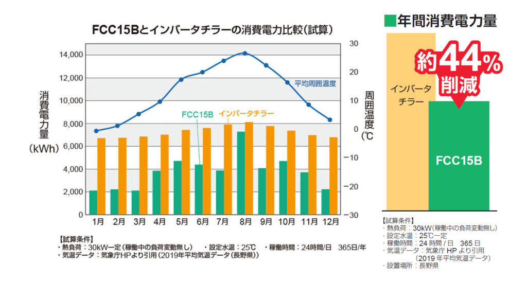 日本の四季で冬季から中間期にかけて外気温が低い時期は、フリークーリングがメインで冷却を行うため、年間消費電力の大幅な節電が可能になります。
