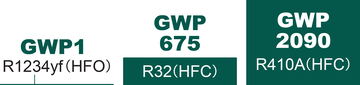 ノンフロン冷媒R1234yfは既存冷媒と比較して地球温暖化係数(GWP)が低く、オゾン破壊係数(ODP)はゼロと環境にやさしい冷媒です。