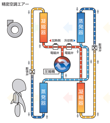 ヒートポンプバランス制御とは、1台のエアコンで冷房と暖房を同時に運転しているようなもので、そのバランスの高度なコントロールにより空調しています。つまり通常のエアコンのように室内から室外へ、あるいは室外から室内への一方的な熱移動ではなく、常に無駄のない熱移動を可能とした新しい制御方式であり、高度な制御技術により省エネと高精度運転を両立した最新のテクノロジーです。