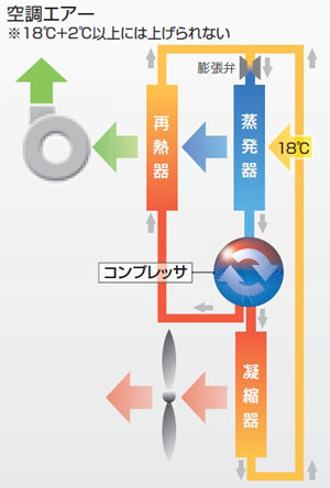 凝縮器(再熱器)を二つ設け、その排熱を利用することにより蒸発器を通過されたエアーを再加熱して空調する制御方式です。仮に100%の冷媒ガスが再加熱側に循環したとしても蒸発器への循環量に変化はなく冷却能力は同じですのでコンプレッサ動力分のみしか加熱能力がないため、吸込周囲温度+2℃以上の空調をすることはできません。