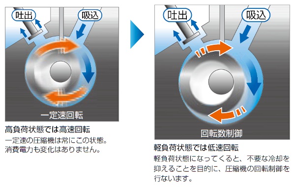 負荷の低い時には圧縮機の回転数制御をおこない、ヒートポンプバランス制御と併せ、さらなる省エネを実現します。一定速の圧縮機では不可能な制御となります。