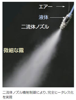 加湿方式は二流体ノズル水噴霧加湿方式の採用により完全ヒータレスで省エネを実現。湿度制御は±1%と精密制御を可能にしています。