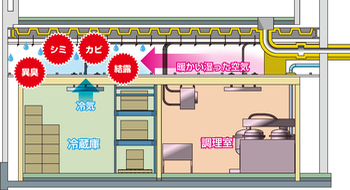 調理時に発生する熱や水蒸気によって高温多湿な空気が発生。天井に上昇すると隣接する冷蔵庫の冷えた空気に触れて結露が発生します。