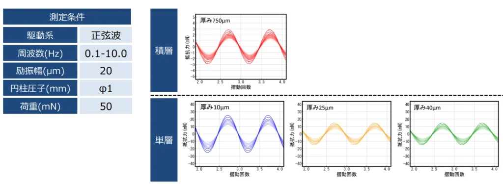 レオメーターでは難しいとされる、500μm以下の厚みの試料でも測定可能です