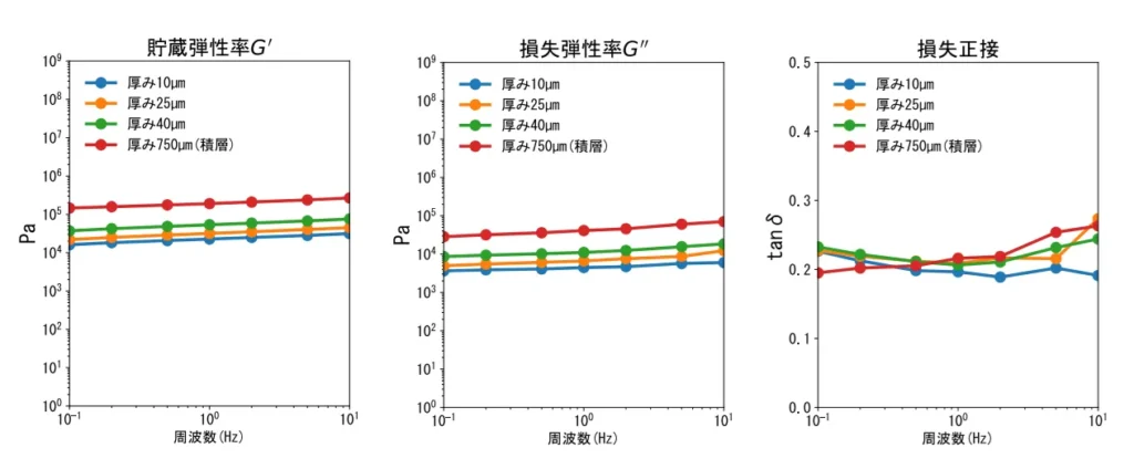 → 積層した試料の方が弾性率は大きくなるものの損失正接の値に大きな変化なし