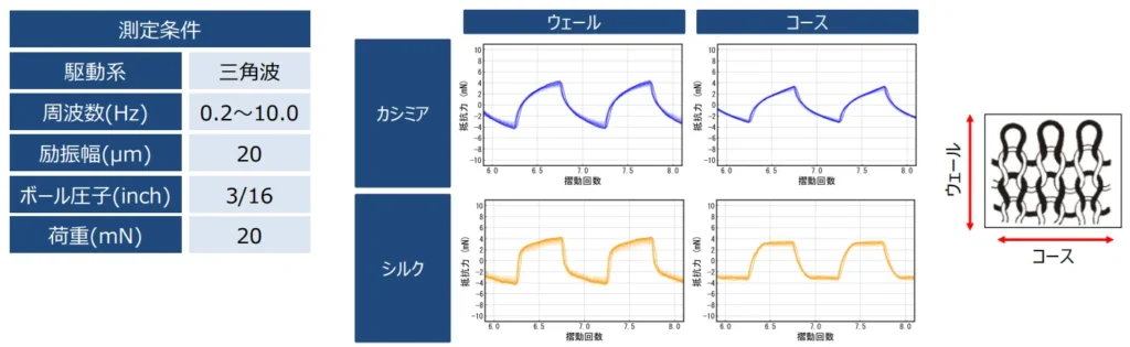 →シルクのウェール方向では、三角状と矩形状が混在する形状であるためせん断力と動摩擦力を同時に検出