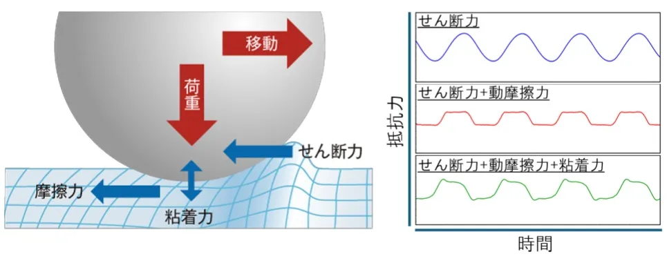 素材表面を擦ったときに発生する摩擦力・せん断力・粘着力を検出可能