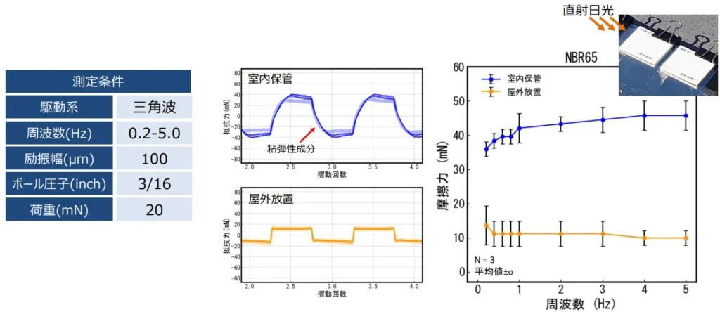 硬度65°のニトリルゴムを屋外放置したときの摩擦力の変化を評価