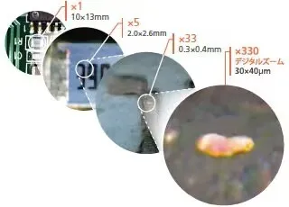 広視野カメラと顕微カメラが試料観察をサポートします。広視野カメラでは最大10×13mmでの広い視野観察が可能なだけでなく、可変デジタルズームにも対応します。さらに顕微カメラと位置情報を共有し、最小30×40μmという非常に狭い視野まで、約330倍のデジタルズーム機能を実現しました。(顕微カメラは10倍までの可変デジタルズームに対応)