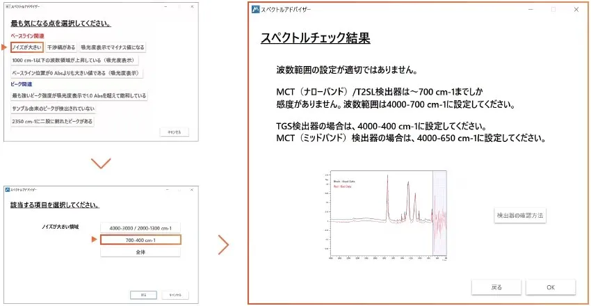 赤外顕微鏡特有の操作や付属品によるトラブルシューティングを実装しました。測定したスペクトルと測定事例を照らし合わせることで改善策を提案します。これにより、より質の高いデータの取得が可能です。