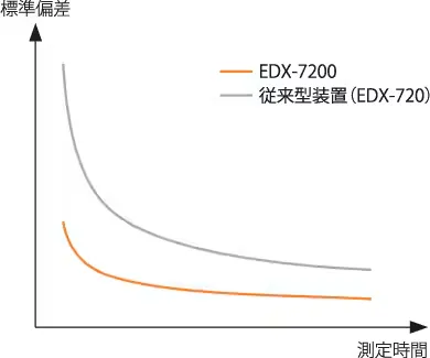 蛍光X線分析では、測定時間を長くして蛍光X線のカウント数を増やすことで精度(繰り返し再現性)を向上させることができます。高計数率のSDD検出器、高速回路を搭載したEDX-7200では、従来型装置(EDX-720)に比べより短い測定時間で目的の分析精度を得ることができます。