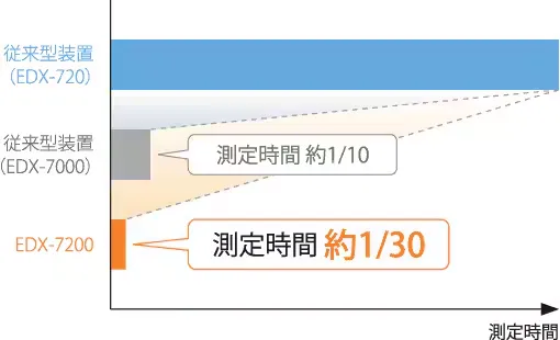 従来型装置(EDX-720)比30倍の計数量を実現する高速回路を搭載。アルゴリズムの改良と基本性能アップにより測定時間を短縮し、さらに使いやすさも向上しました。