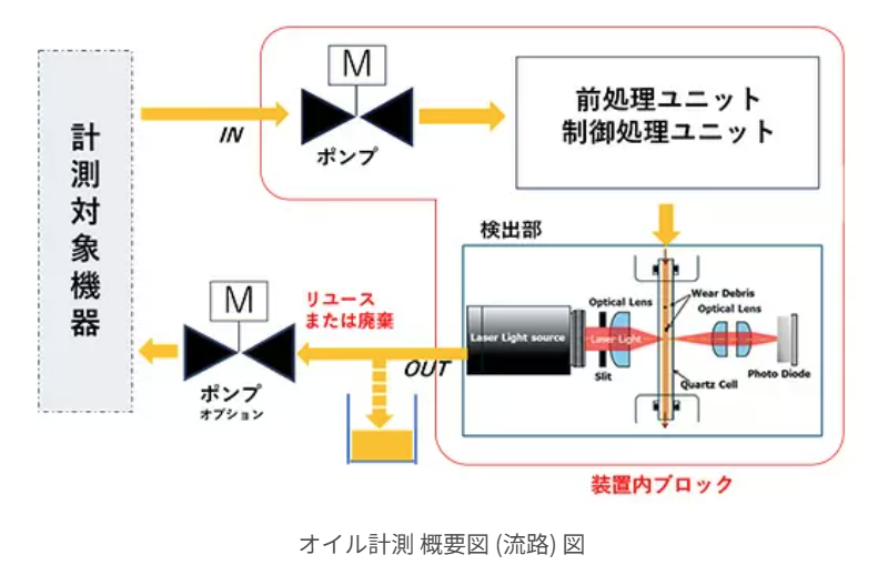 製造現場、研究所、大学などの施設で利用される潤滑油内の監視をPI-1000で行うことで、自動で大きさごとに摩耗紛のデータを取ることが可能になります。